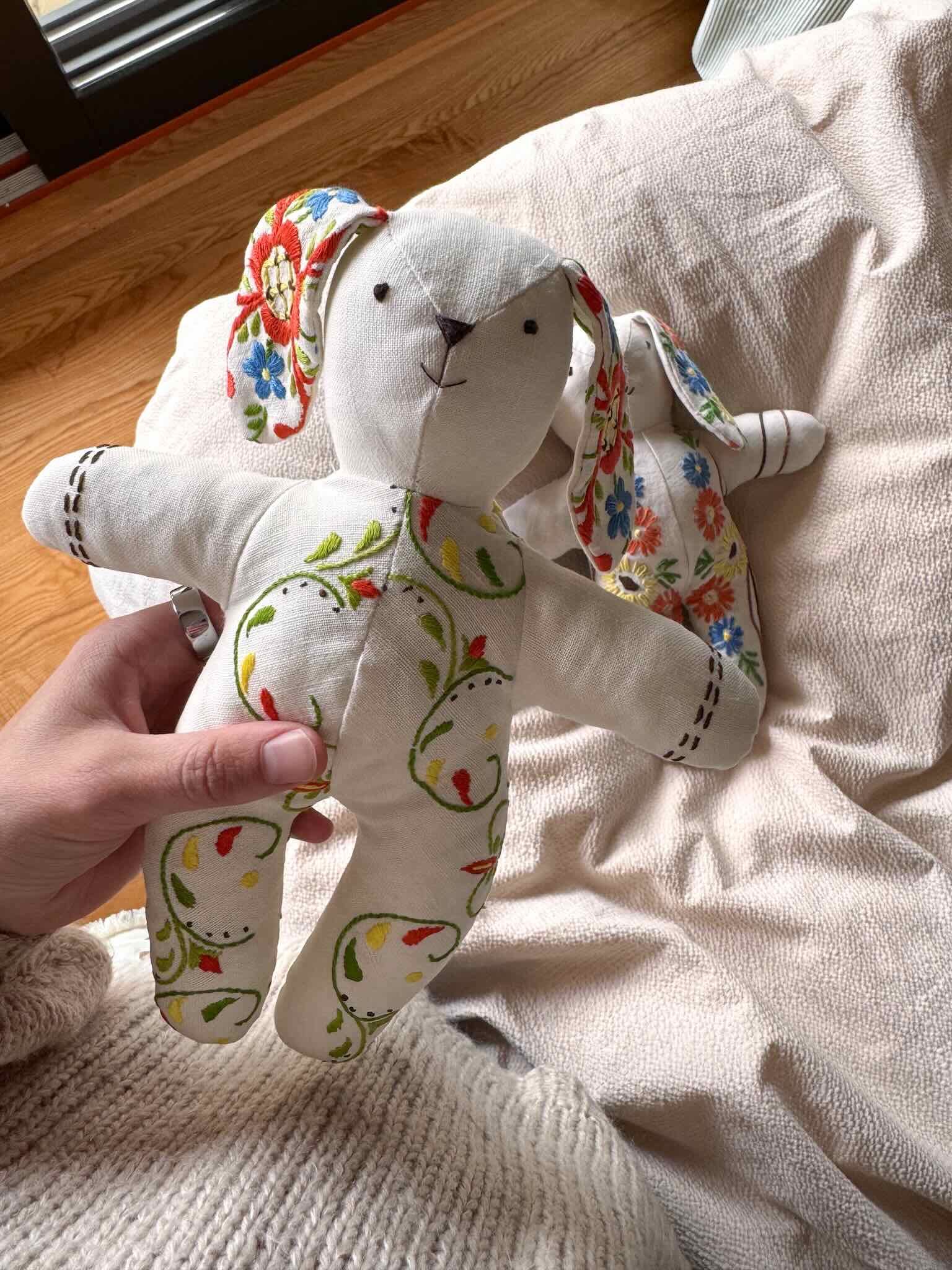 Hopp og sprett og tjo og hei! Denne kanin-bamsen designet Lysne tidlig i sin sy-karriere. Den er blitt yndlingsbamsen til mange små barn. Og det beste: sys den i naturmaterialer og fylles med ull, er den helt fri for mikroplast. Det er det ikke mange bamser som kan skryte på seg. I tillegg er lille kanin perfekt å sy av stoffrester etter andre prosjekter.Bruk faste stoffer, ikke for tynne. Fjeset broderes på med det du har tilgjengelig av tråd eller garn.